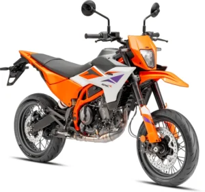 La KTM 390 SMC R modello 2026, nella categoria Supermotard, è equipaggiata con un motore Monocilindrico - 4 tempi, che sviluppa 45 CV (33.1 kW) e offre una coppia di 40.2 Nm (4,10 mkg), per un peso a pieno carico di 161 kg (154 kg a secco).